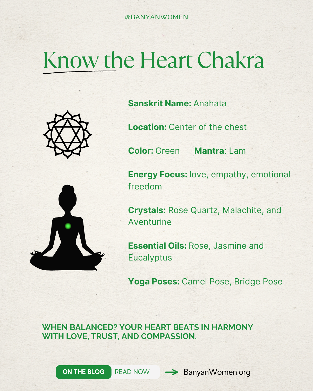 Yoga teacher and hypnotherapist Carla explains the heart’s importance in our wellbeing: “The heart chakra is truly the center of the 7 chakra system and it connects our physical existence - root, sacral, and solar plexus - with our spiritual centers - the throat, third eye, and crown. I often like to think of the heart as the root of the spiritual chakras. This is the true seat of our intuition, clairempathy, or clairsentience - here we receive information through our emotions. Our emotions indicate to us our authentic truths, what direction we should move in, and who we should be in relationships with. The heart also represents our capacity for embracing and enjoying life.”