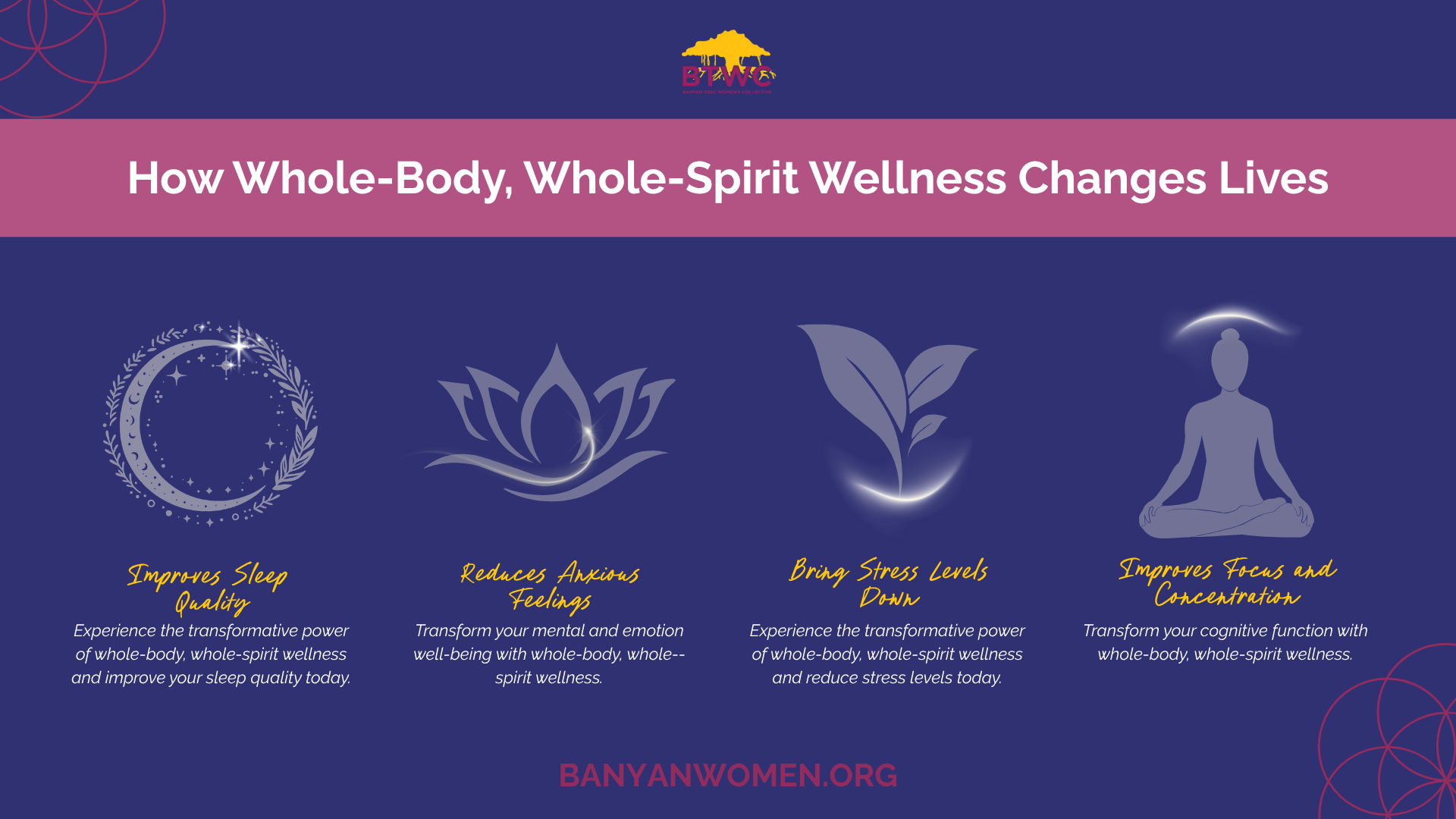 At Banyan, we support women with whole-body whole spirit wellness. You can find out more about our events and partnerships here.